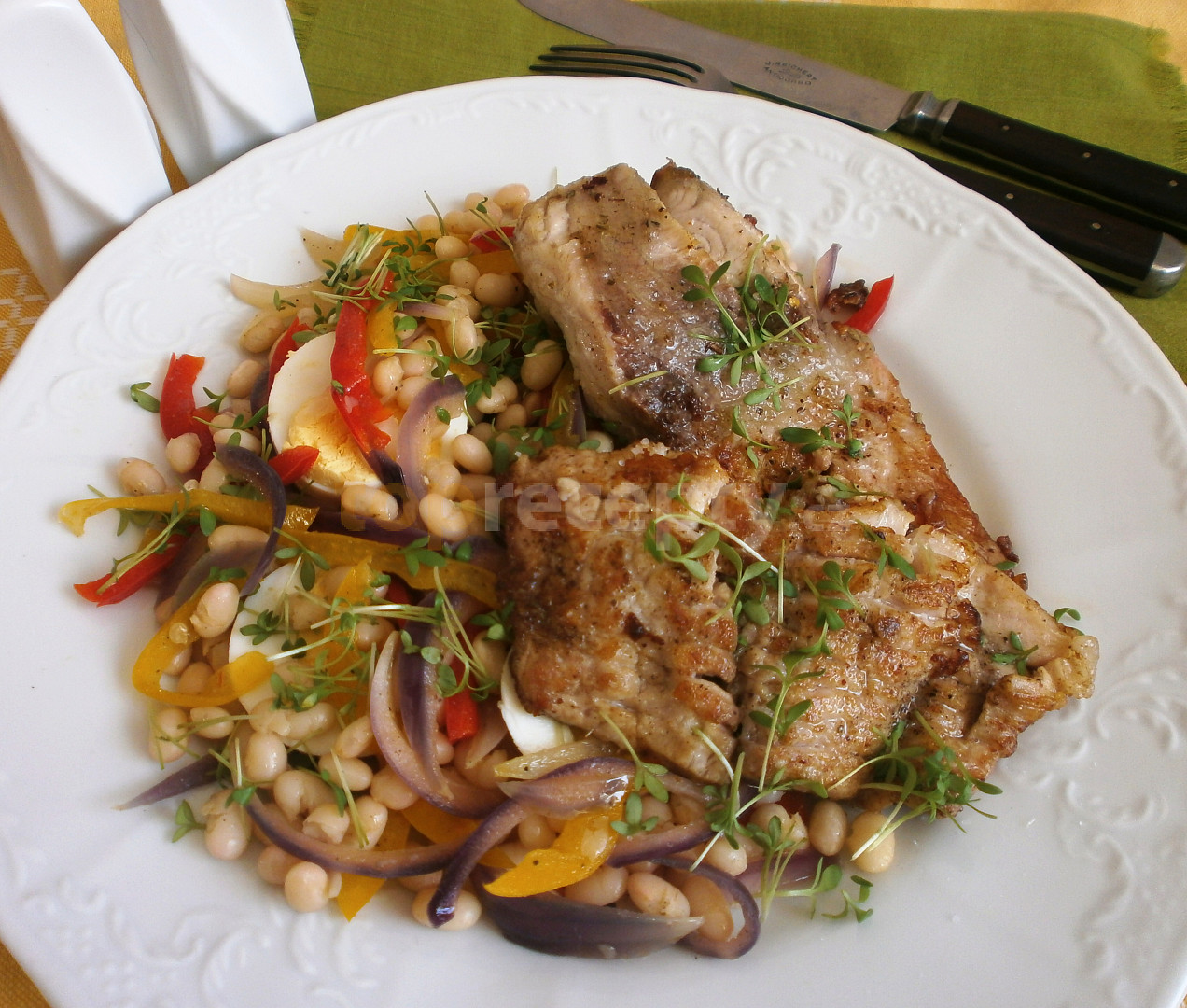 filet z kapra, fazole, paprika čerstvá červená, paprika čerstvá žlutá, cibule červená, sůl, pepř mletý, koření na ryby, olej olivový, máslo, šťáva citronová, vejce, řeřicha