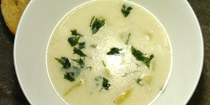 česnek, vývar zeleninový, brambory, cibule, mouka hladká, máslo, pepř mletý, sůl, česnek sušený medvědí, tymián, smetana ke šlehání, petrželka, krutony