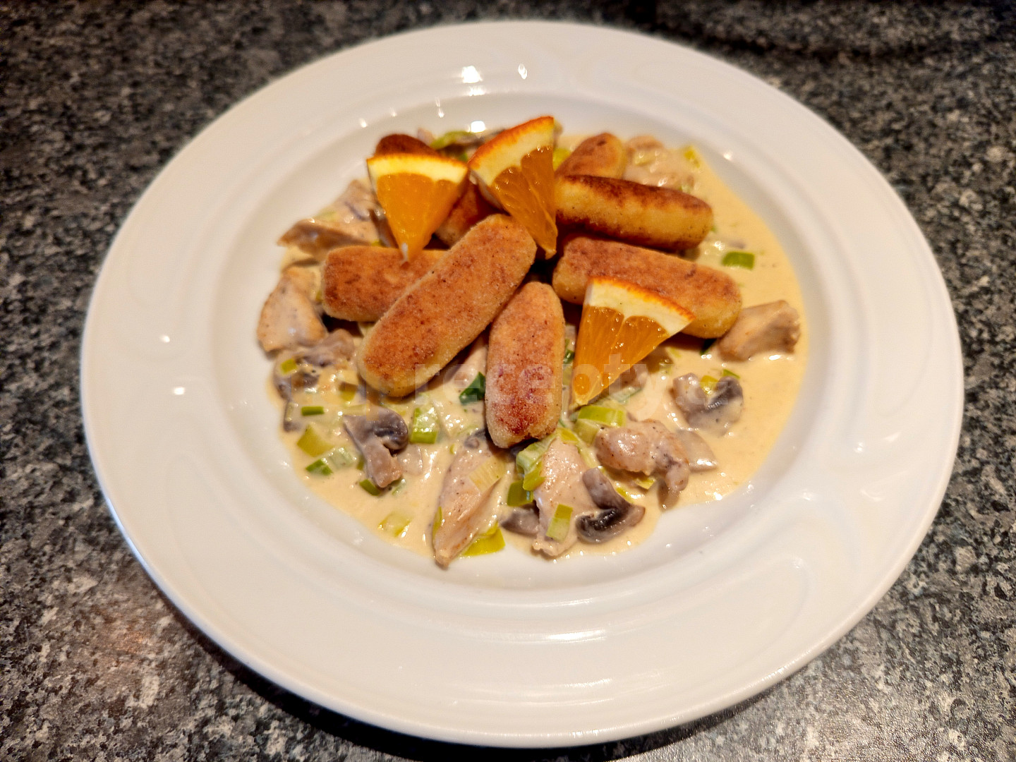 prsa kuřecí, žampióny, pórek, pomeranče, smetana ke šlehání, olej, sůl, pepř mletý