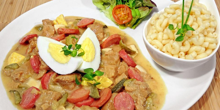 kostky sojové, cibule, párky, slanina, okurky sterilované, vejce, hořčice, smetana zakysaná, vývar hovězí, mouka hladká, bujón, sůl, pepř mletý