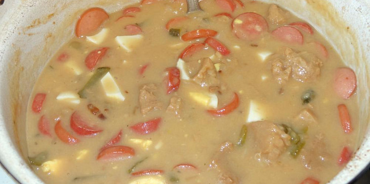 kostky sojové, cibule, párky, slanina, okurky sterilované, vejce, hořčice, smetana zakysaná, vývar hovězí, mouka hladká, bujón, sůl, pepř mletý