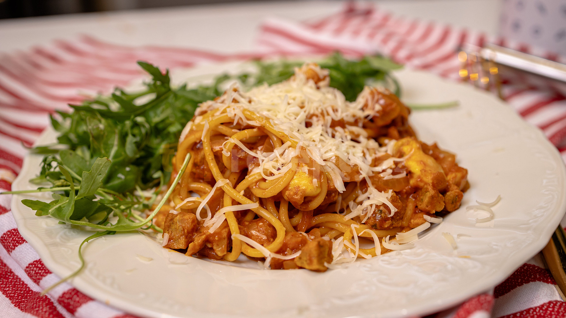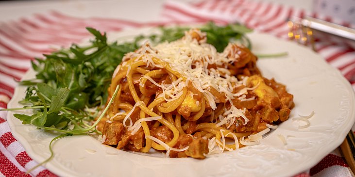 těstoviny špagety, cibule, tuk, sekaná, protlak rajčatový, cukr krupice, koření kari, paprika sušená sladká, sýr strouhaný