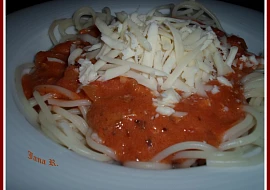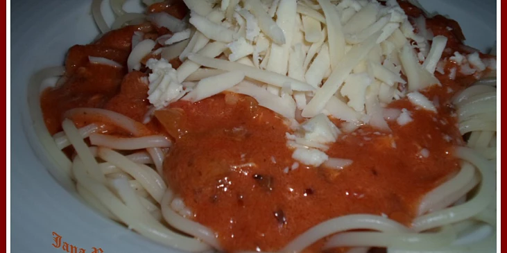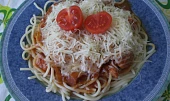 rajče, paprika čerstvá červená, cibule, olej, protlak rajčatový, vejce, sůl, pepř, paprika sušená pálivá, bazalka čerstvá, koření oregáno, voda, maso kuřecí, škrob kukuřičný, kečup ostrý, sýr nastrouhaný, těstoviny špagety