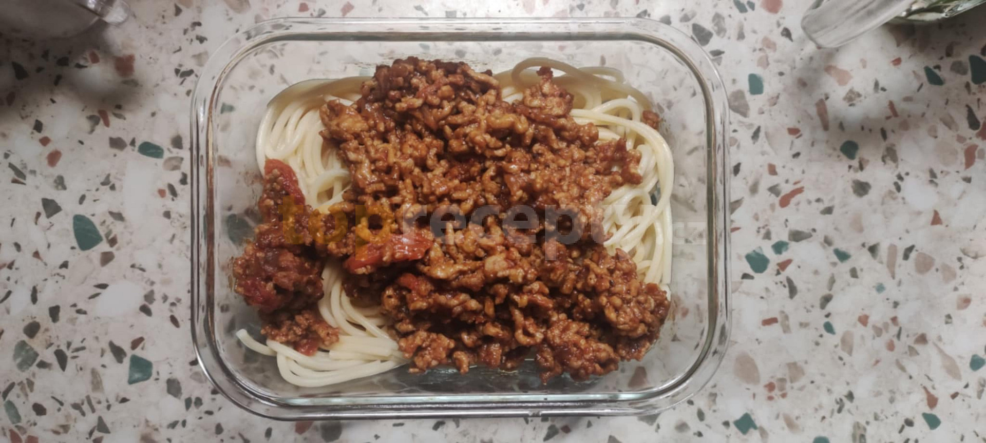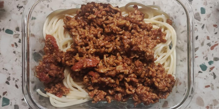 těstoviny špagety, maso mleté, kečup sladký, protlak rajčatový, rajče cherry, cibule, česnek, sušená bazalka, koření na mleté maso, pepř mletý, sůl, olej, sýr strouhaný