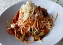 těstoviny špagety, rozmarýn, sůl, pepř, cibule šalotka, česnek, tuňák v konzervě, fazolky mražené, mrkev mražená, rajče, protlak, olej, sýr strouhaný