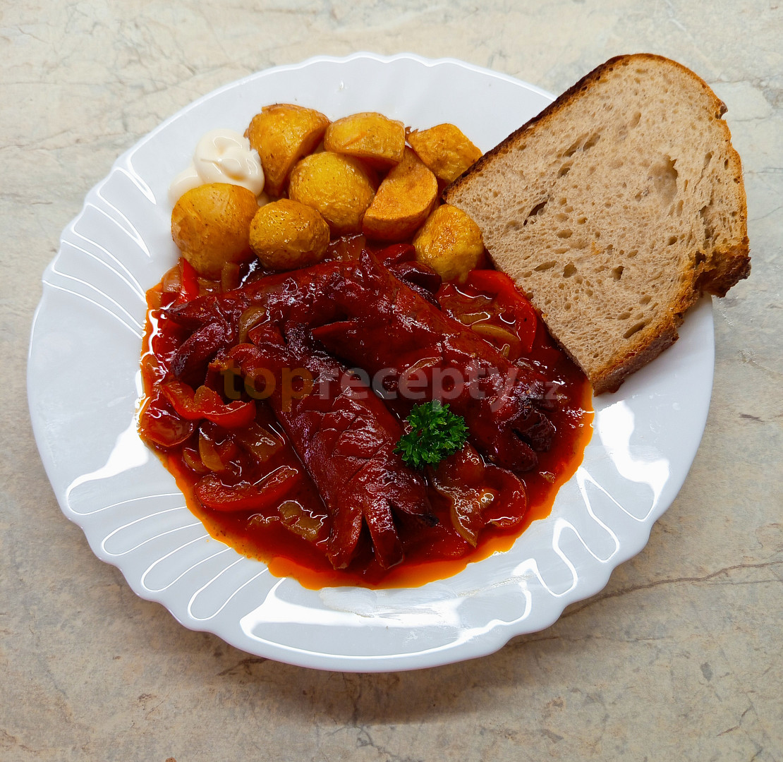 špekáček, cibule, paprika, rajče, česnek, pivo černé, kečup sladký, omáčka steak barbecue, olej, koření grilovací, tymián, kmín drcený, sůl, pepř mletý
