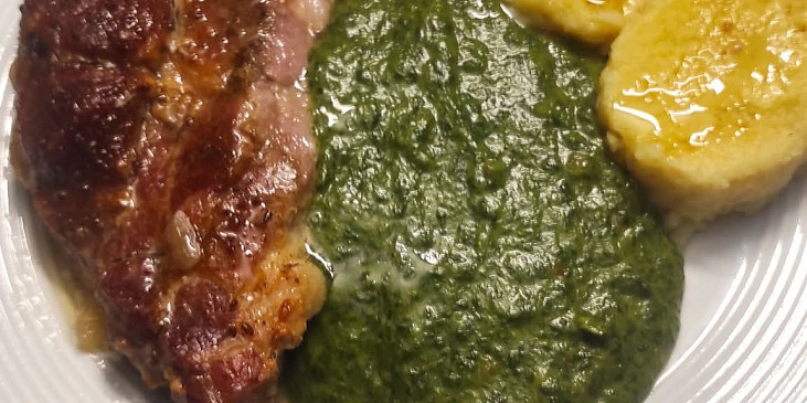 špenát, cibule, česnek, mouka polohrubá, olej, sůl, pečeně vepřová, cibule, česnek, pepř, olej, maso, máslo