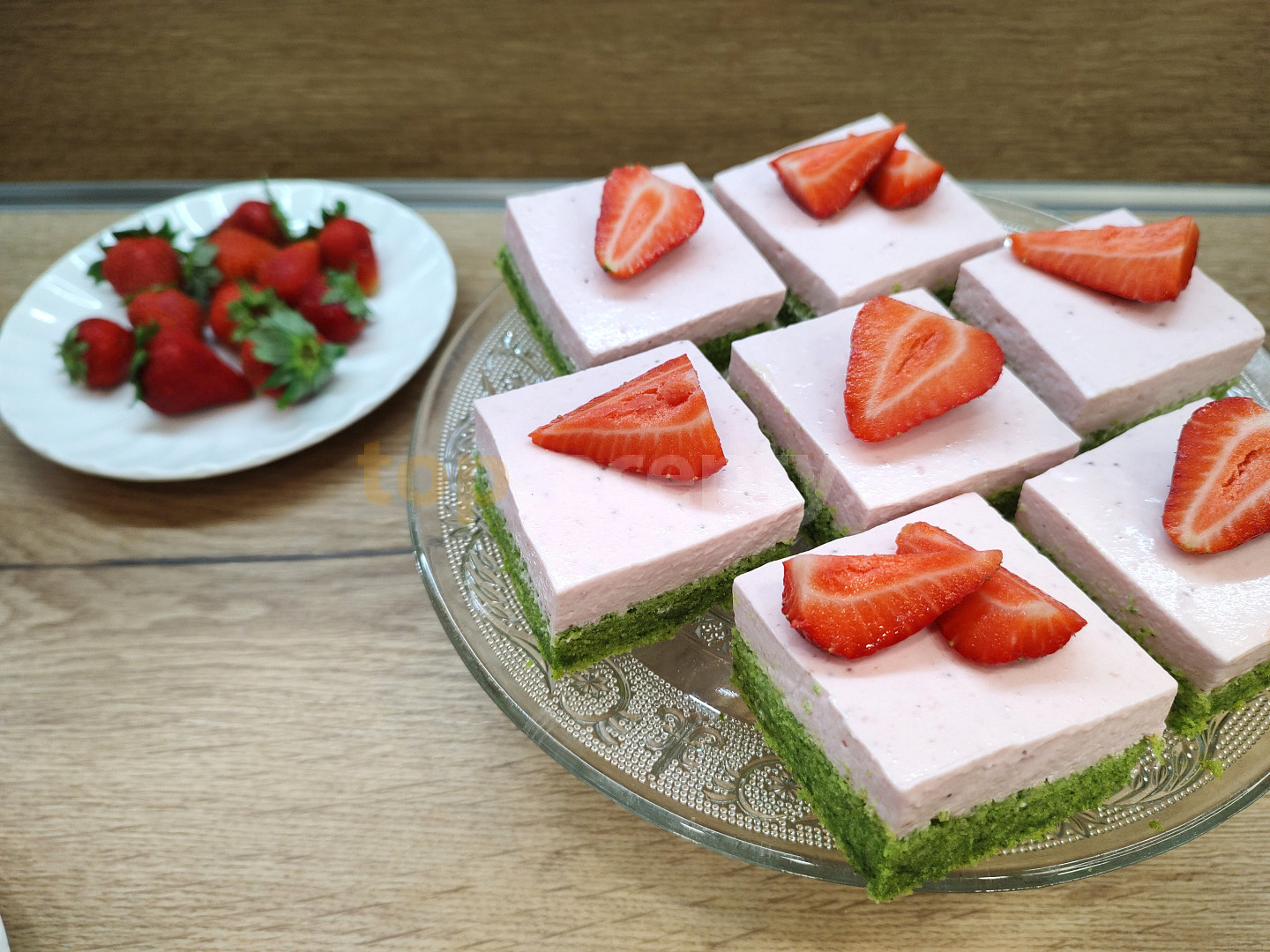 vejce, cukr moučkový, olej, špenát baby, mouka hladká, kypřící prášek do pečiva, smetana ke šlehání, tvaroh ve vaničce, smetana zakysaná, jahody, cukr moučkový, želatina