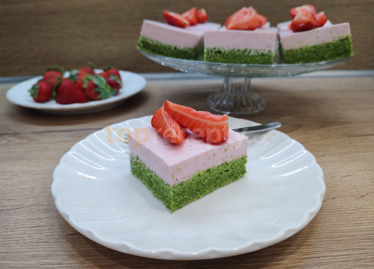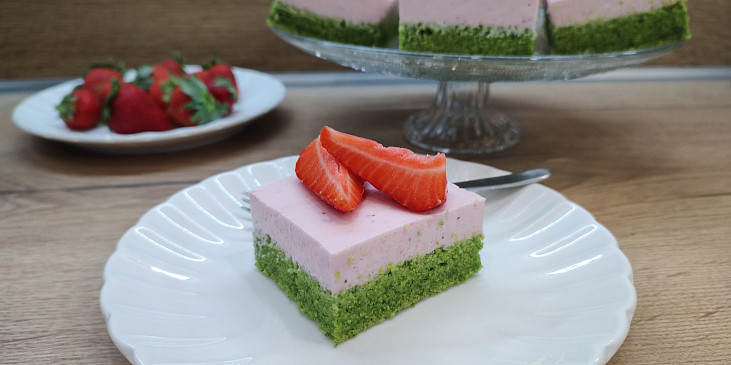 vejce, cukr moučkový, olej, špenát baby, mouka hladká, kypřící prášek do pečiva, smetana ke šlehání, tvaroh ve vaničce, smetana zakysaná, jahody, cukr moučkový, želatina
