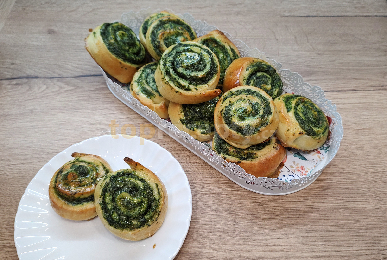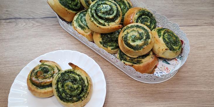 mouka hladká, droždí sušené, mléko, olej rostlinný, žloutek, sůl, špenát listový mražený, cibule, česnek, olej, sýr, sýr parmazán strouhaný, sůl, pepř mletý