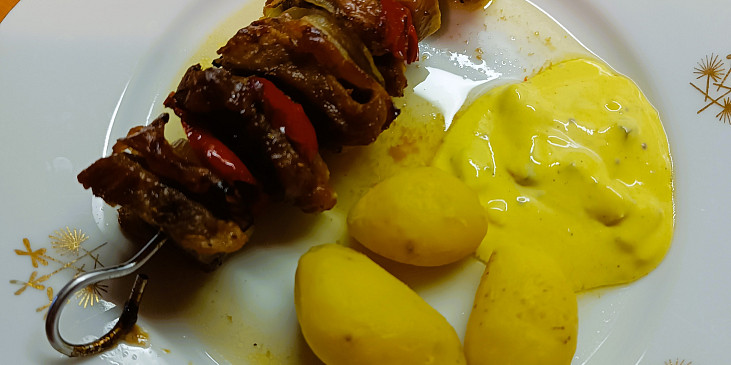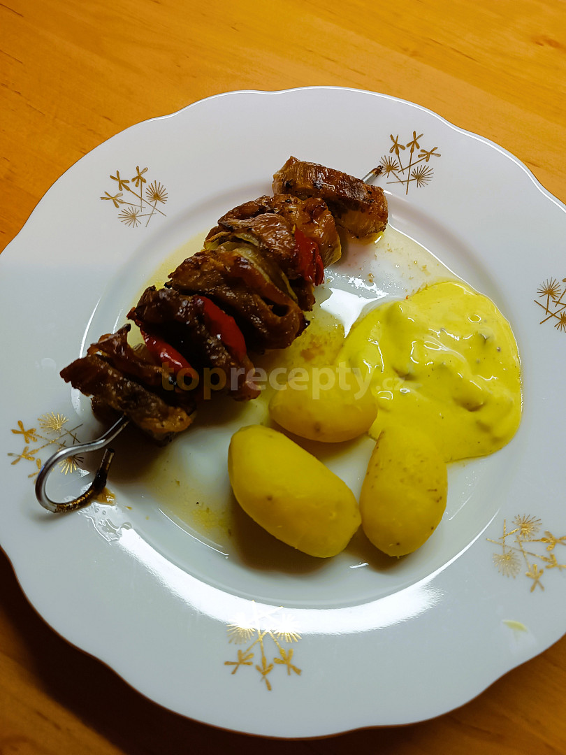 maso vepřové, slanina anglická, cibule, paprika čerstvá zelená, sůl, koření mexiko, olej