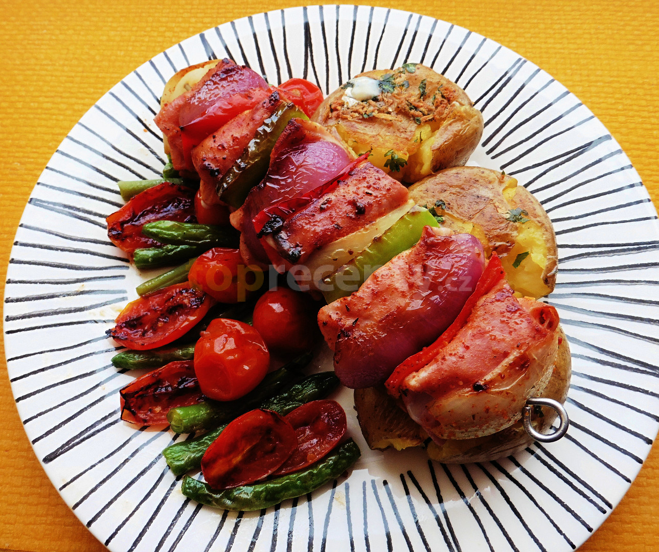 sýr hermelín, šunka, cibule, cibule červená, paprika čerstvá zelená, paprika čerstvá červená, olej slunečnicový, sůl, koření grilovací