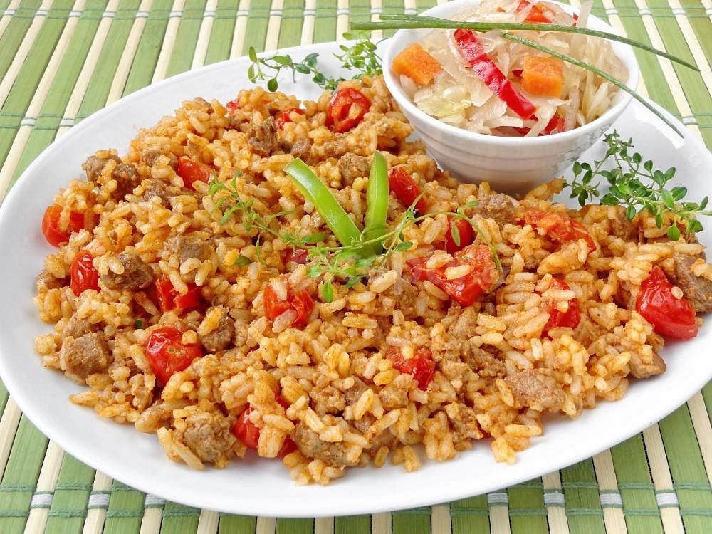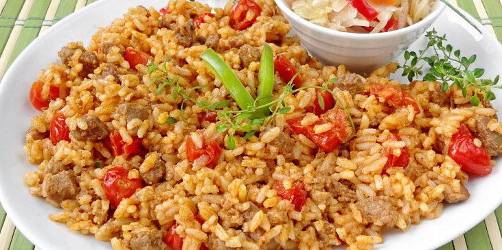 plec vepřová, slanina, cibule, rajče cherry, protlak rajčatový, rýže dlouhozrnná, sůl, pepř mletý, paprika sušená sladká, paprika sušená pálivá, olej