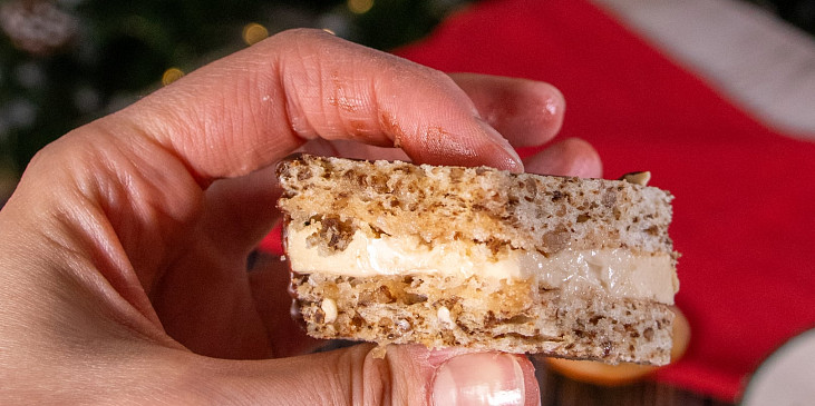 bílek, ořechy mleté, cukr krupice, mouka hladká, cukr moučkový, tuk, mouka hrubá, máslo, cukr krupice, vejce, káva, čokoláda