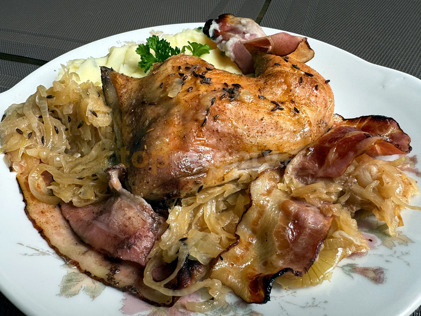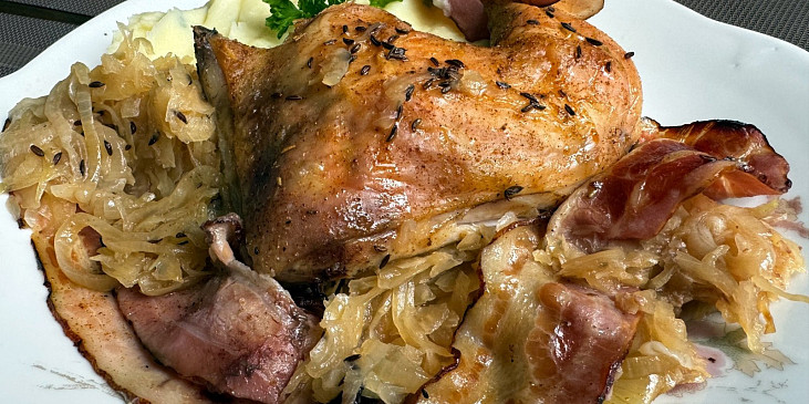 kuře čtvrtky, zelí bílé, sůl, kmín celý, slanina anglická, cibule