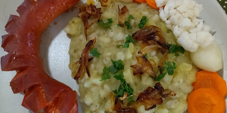 krupky, brambory, mléko, máslo, česnek, majoránka sušená, sůl, cibule sušená smažená