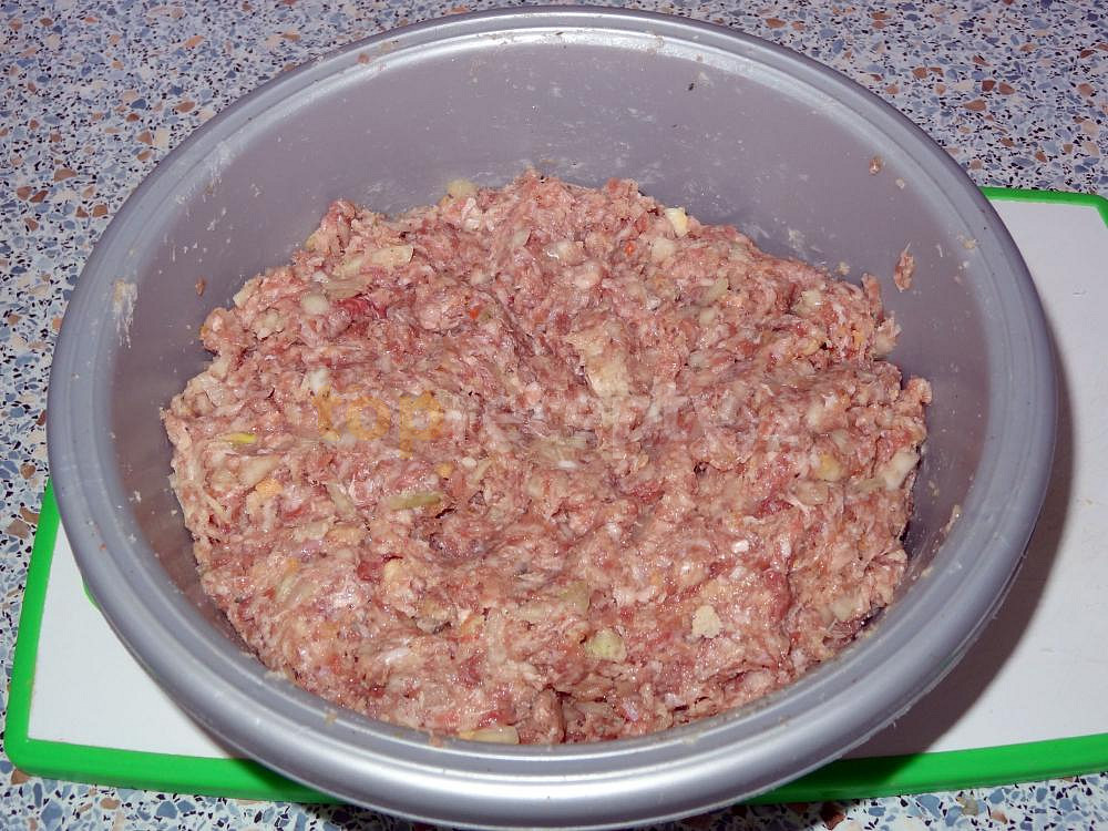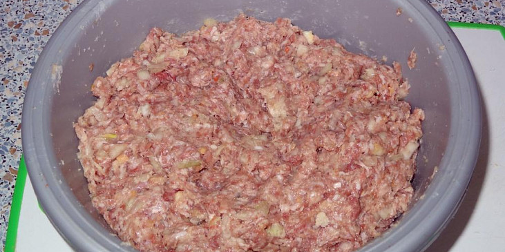 maso králičí, bok vepřový, cibule, houska, mléko, vejce, slanina, máslo, vývar masový, sůl, pepř mletý, tymián, majoránka, zázvor mletý, koření hřebíček