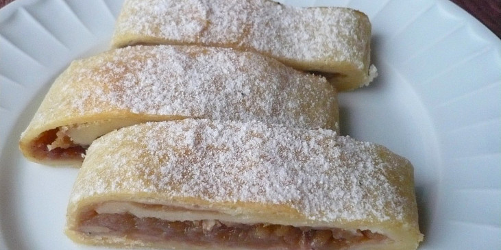 mouka polohrubá, máslo, tvaroh měkký, sůl, jablko, perník strouhaný, strouhanka, skořice mletá, cukr krystal, rozinky, ořechy, vejce, tuk, cukr moučkový