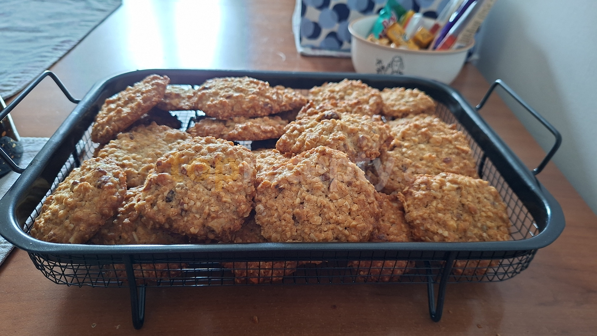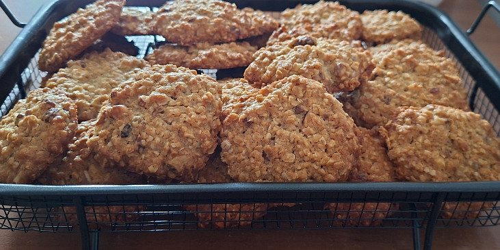 mouka hladká, kypřící prášek do pečiva, skořice, máslo, cukr krystal, vejce, cukr vanilkový, vločky ovesné, ořechy, čokoláda