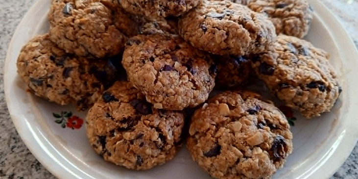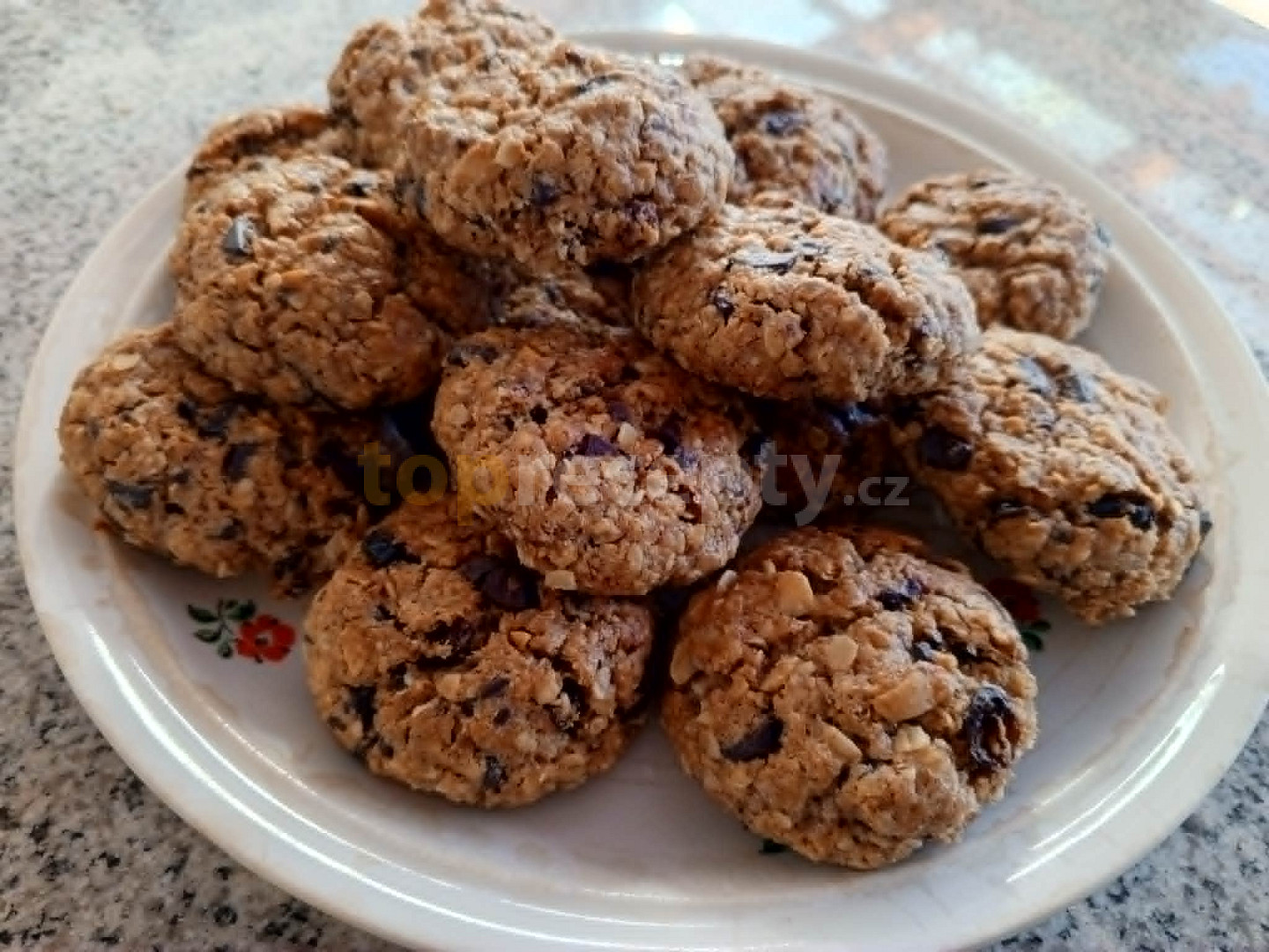 mouka hladká, kypřící prášek do pečiva, skořice, máslo, cukr krystal, vejce, cukr vanilkový, vločky ovesné, ořechy, čokoláda