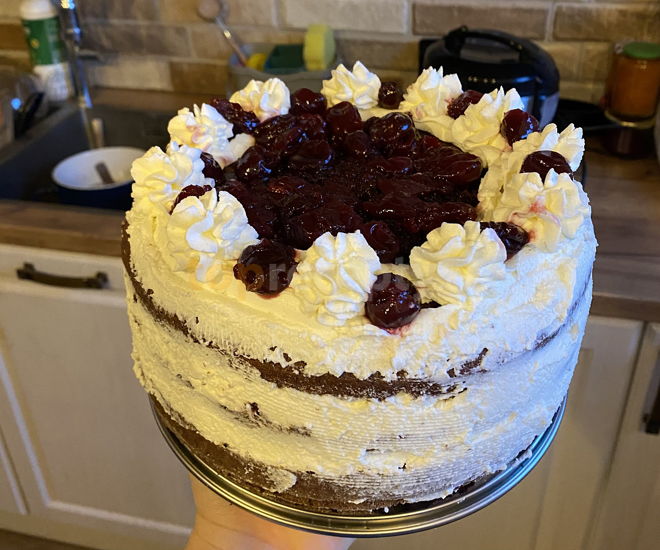 vejce, cukr, čokoláda na vaření, máslo, švarcvaldská třešňovice, mouka hladká, kypřící prášek, sůl, škrob pšeničný, ořechy lískové mleté, smetana ke šlehání, cukr vanilkový, kompot višňový, zdobení čokoládové