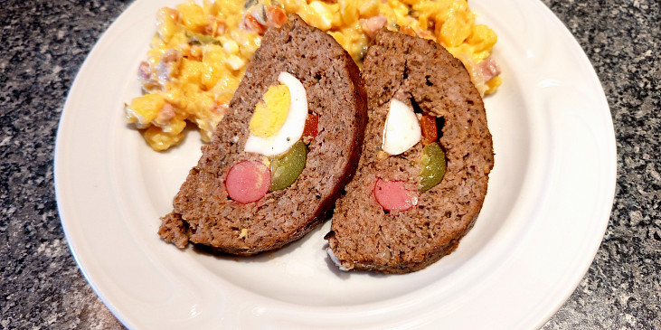 maso mleté, vejce, vejce, párky, okurky sterilované, hranolky, česnek, cibule, kečup sladký, hořčice plnotučná, paprika sušená uzená, strouhanka, kmín drcený, sůl, pepř mletý, majoránka, olej, voda