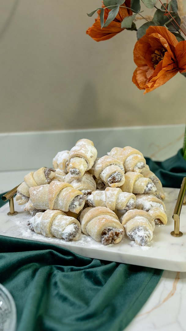 mouka hladká, máslo, mléko, droždí čerstvé, cukr krupice, žloutek, sůl, ořechy vlašské, mléko, cukr třtinový, piškoty, skořice, rum, cukr moučkový