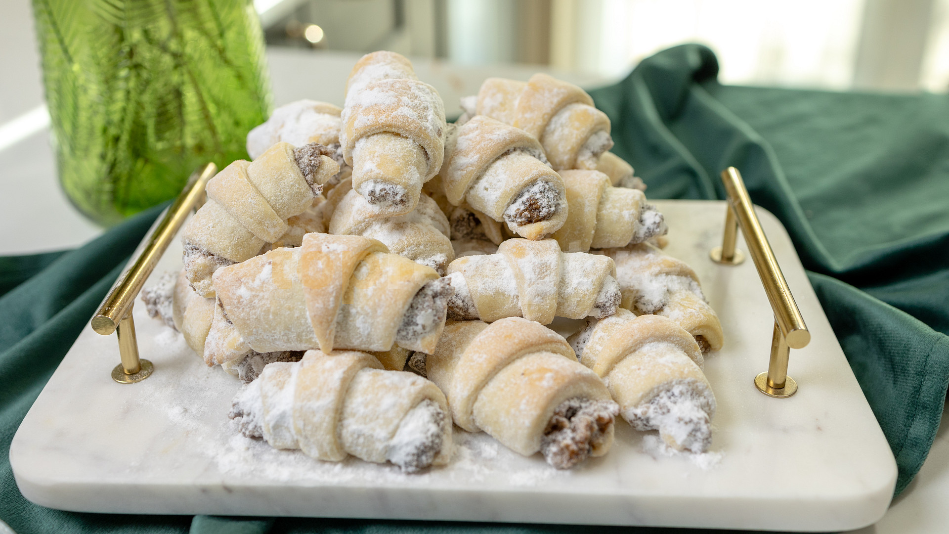 mouka hladká, máslo, mléko, droždí čerstvé, cukr krupice, žloutek, sůl, ořechy vlašské, mléko, cukr třtinový, piškoty, skořice, rum, cukr moučkový