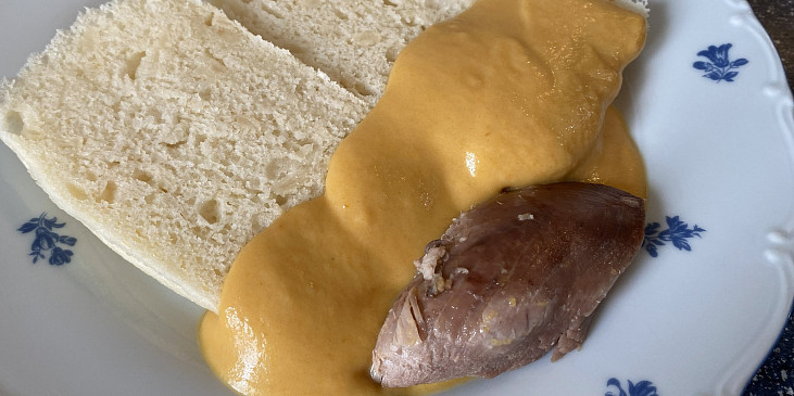 mrkev, petržel, cibule, olej, cukr krupice, vývar hovězí, hořčice plnotučná, bobkový list, koření nové koření, pepř, maso, sůl, rama máslová