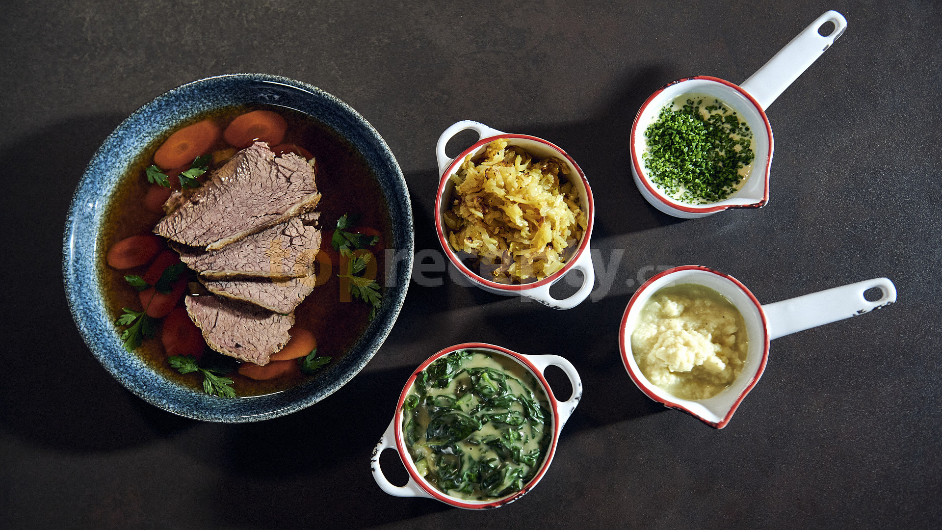 pórek, celer řapíkatý, petržel, mrkev, cibule, petržel, celer, sůl, pepř celý, koření nové koření, bobkový list, chléb toustový, vejce, žloutek, hořčice dijonská, ocet jablečný, mléko, vývar masový, cukr, sůl, olej slunečnicový, pažitka, jablko, křen, šťáva citronová, ocet jablečný, olej slunečnicový, vývar masový, sůl, pepř mletý, máslo, mouka hladká, česnek, vývar masový, špenátové listy čerstvé, sůl, brambory, máslo, sůl, pepř mletý
