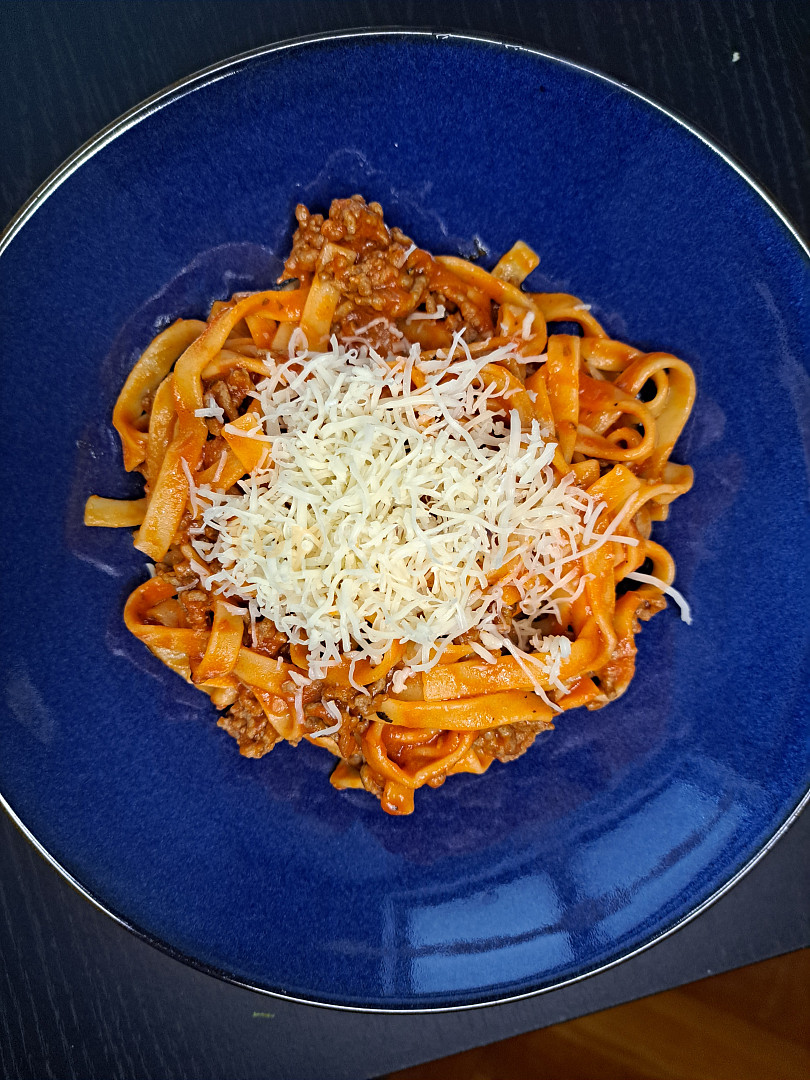 tagliatelle, maso hovězí mleté, passata rajčatová, cibule, česnek, protlak rajčatový, sušená bazalka, sůl, pepř mletý, olej olivový, sýr tvrdý