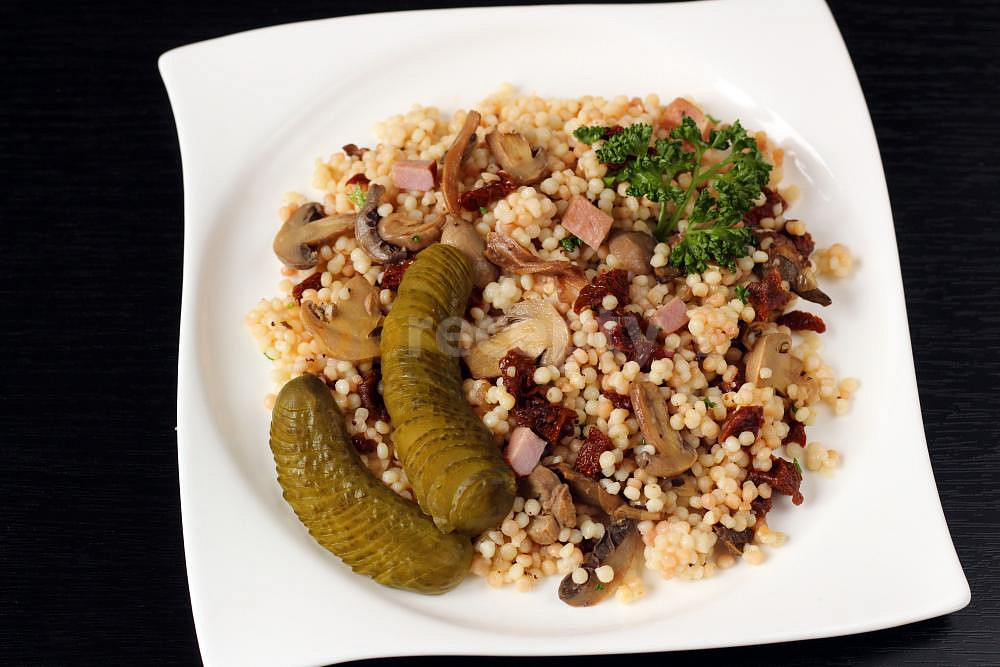 těstoviny tarhoňa, slanina anglická, cibule, žampióny, rajče sušené, sůl, pepř mletý, paprika sušená uzená, olej, petrželka