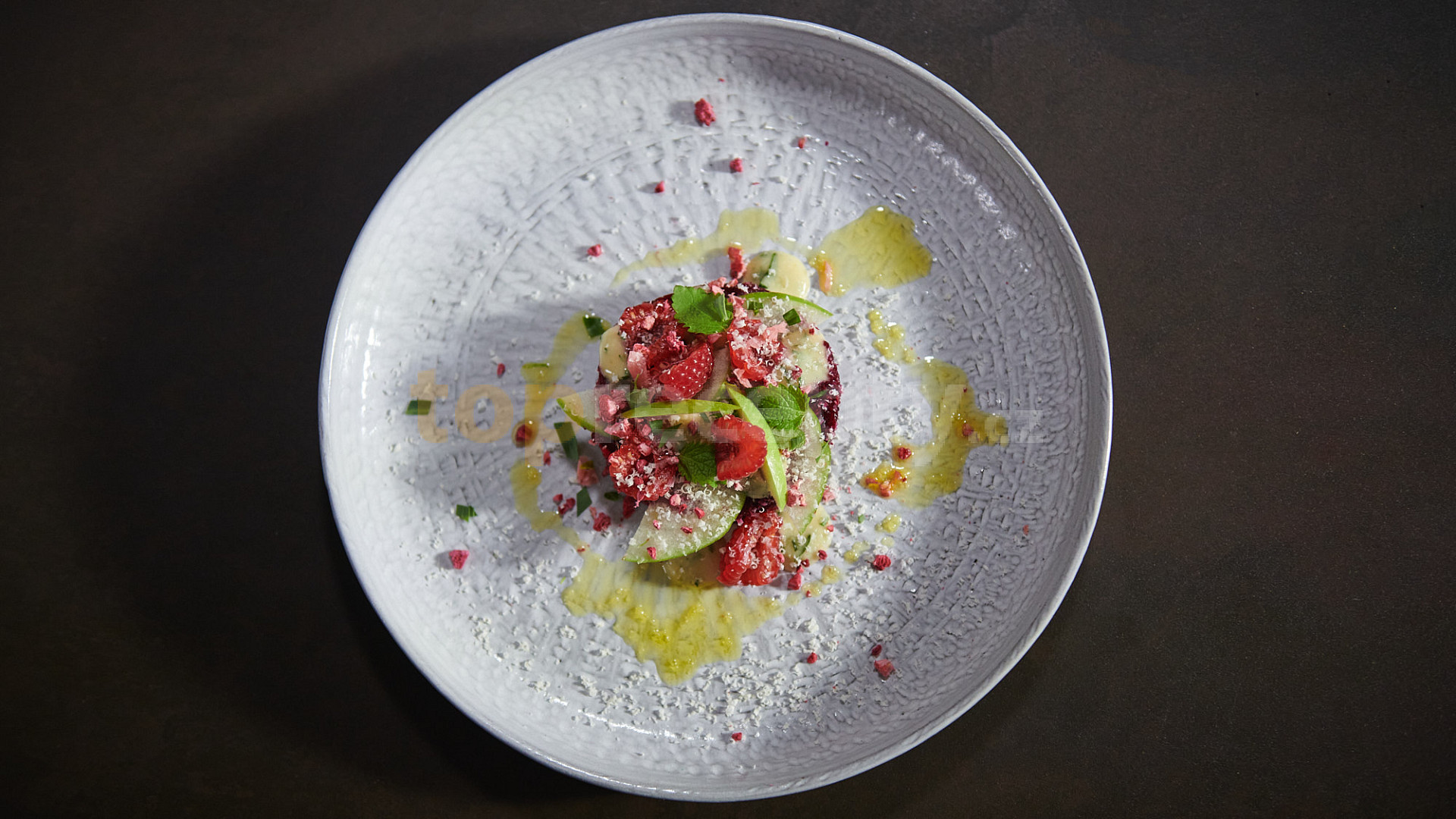 řepa červená, cibule šalotka, hořčice dijonská, olej olivový, ocet balsamiko, zázvor, kůra citronová, šťáva citronová, sůl, pepř mletý, čerstvé bylinky, žloutek, olej slunečnicový, hořčice dijonská, kůra citronová, estragon, ocet, sůl, cukr krupice, jablko, mandle, maliny, maliny, meduňka, estragon, zázvor