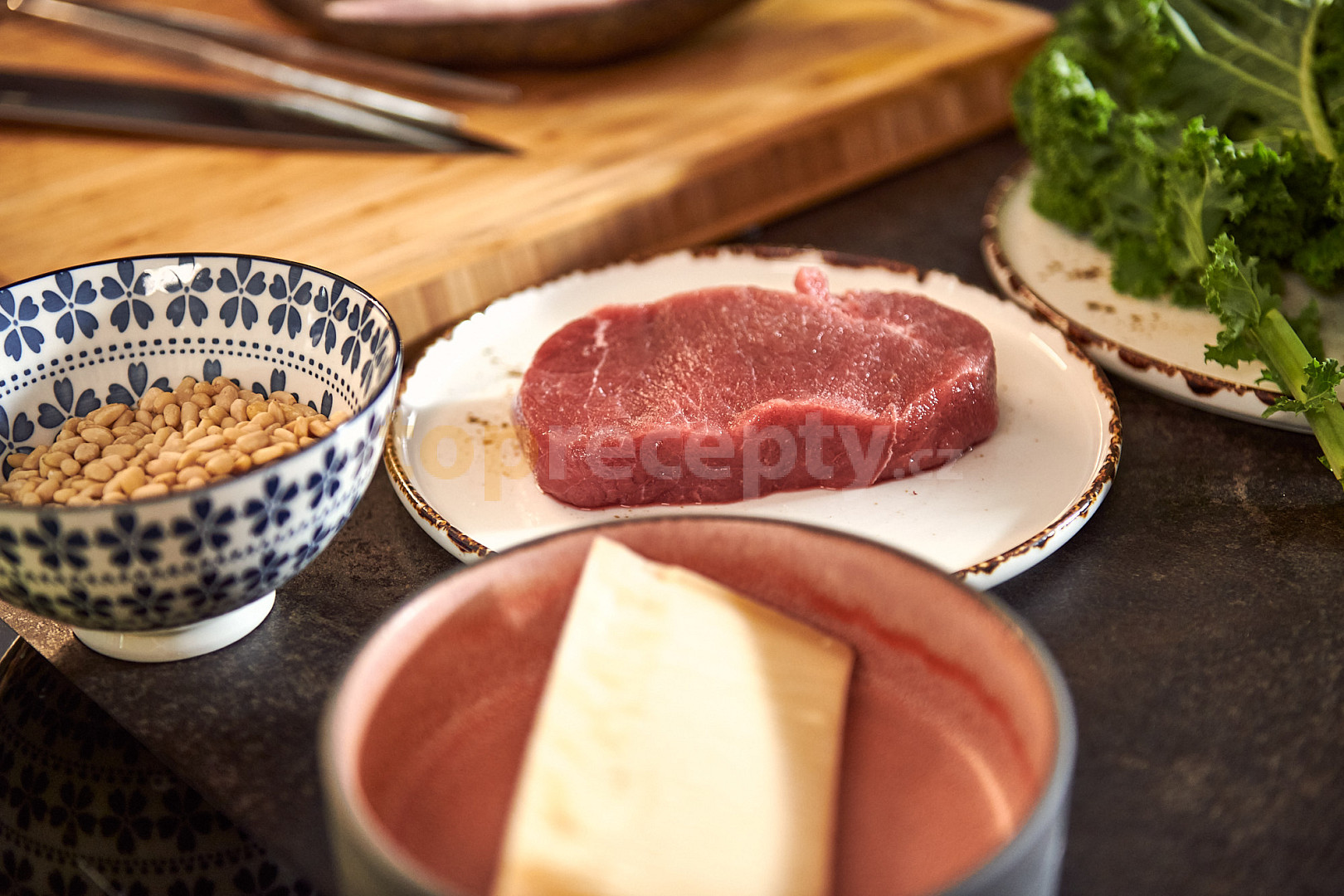 hovězí zadní, olej olivový, pažitka, kadeřávek, parmazán, ořechy piniové, citron, olej, omáčka sojová, chilli paprika čerstvá, sůl, pepř mletý