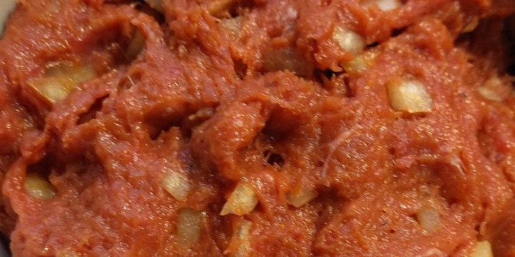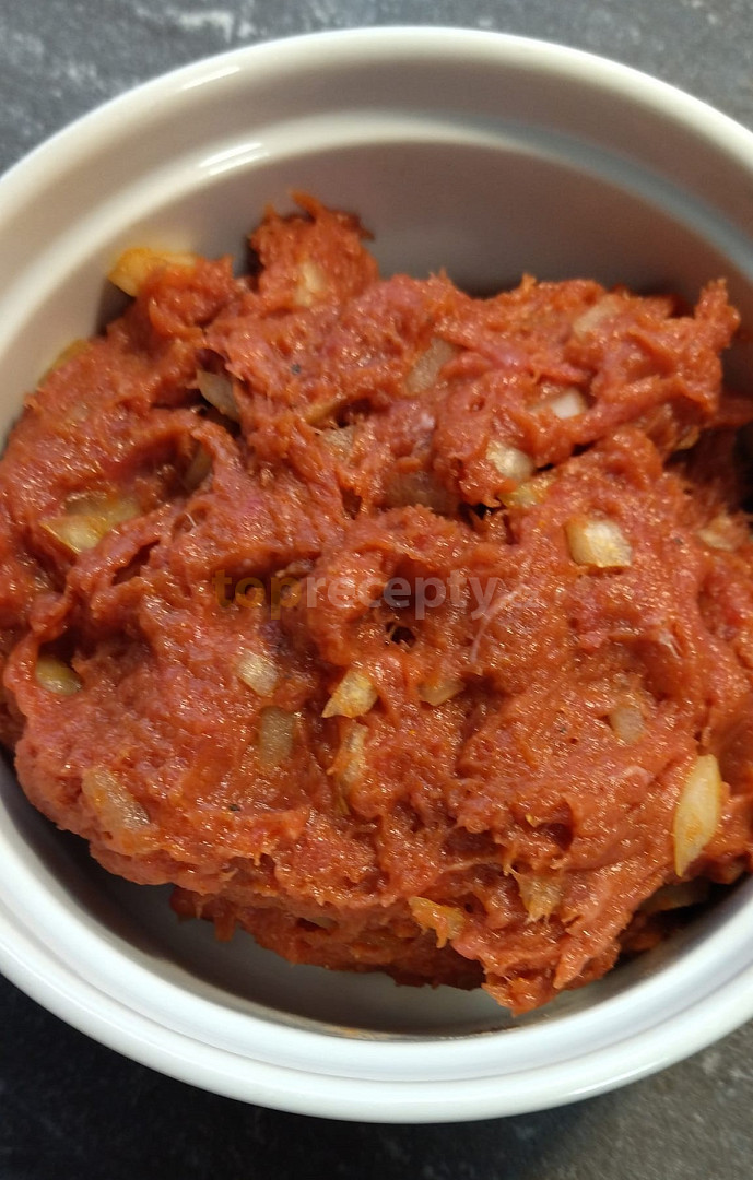 svíčková hovězí, olej, žloutek, cibule bílá, hořčice, kečup sladký, pepř bílý, sůl, topinka, olej, topinka