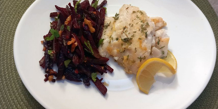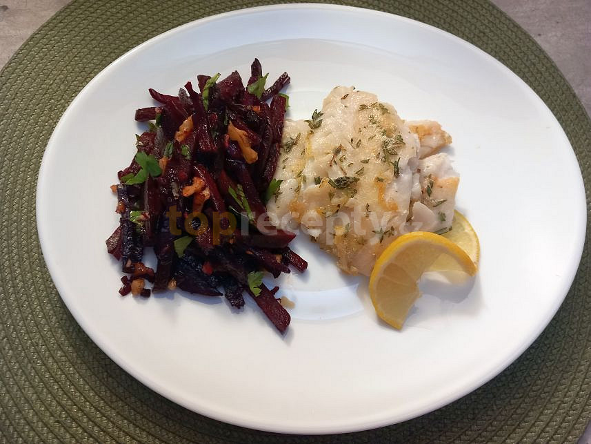 řepa červená, šťáva citronová, olej olivový, cibule, česnek, sůl, pepř mletý, ořech muškátový, kůra citronová, ořechy vlašské, ryba, bylinky, olej olivový, petržel, citron