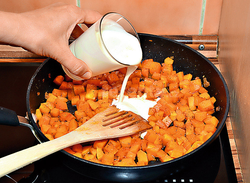 dýně hokkaido, cibule šalotka, olej olivový, cukr třtinový, kurkuma, smetana, sůl, pepř mletý, limetka, koriandr, těstoviny, semínka dýňová