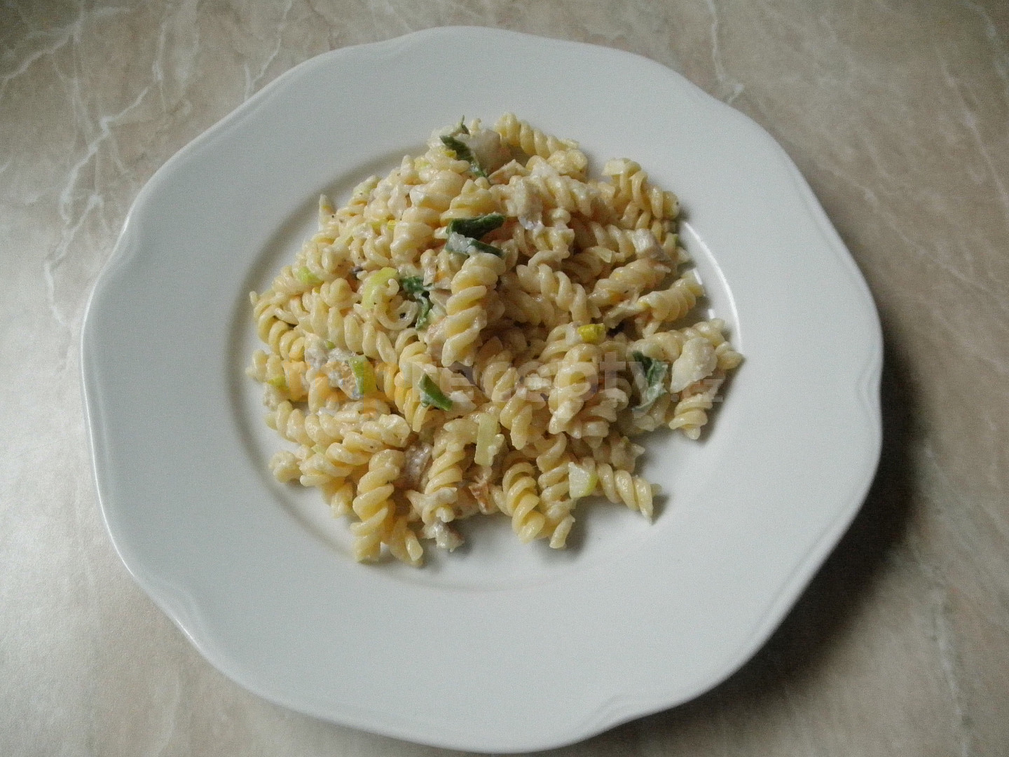 těstoviny, filet z tresky, olej olivový, cibule, pomazánkové máslo, pórek, smetana ke šlehání, pepř citronový, pepř zelený, sůl