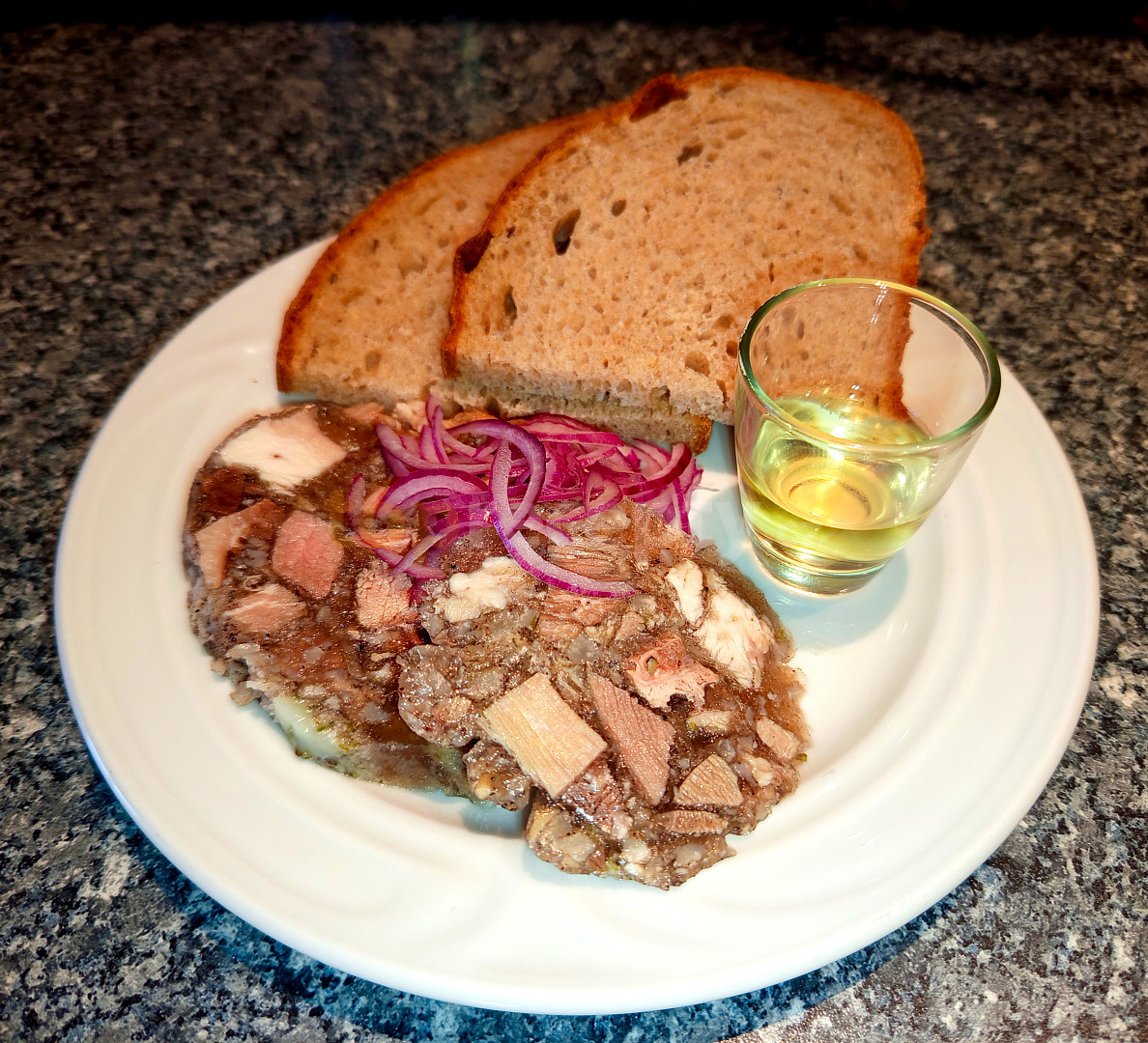 koleno vepřové, plec vepřová, nožička vepřová, voda, cibule, sůl, ocet, česnek, pepř mletý, bobkový list, koření nové koření mleté, majoránka sušená