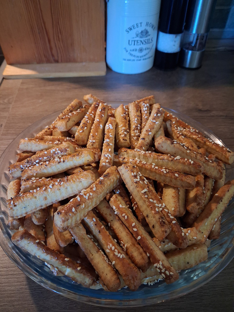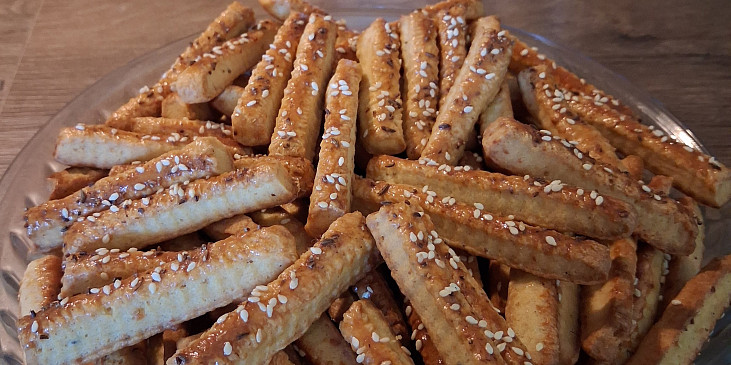 mouka hladká, sýr uzený, máslo, tuk hera, sádlo, smetana ke šlehání, česnek, sůl, koření grilovací, kypřící prášek do pečiva, žloutek, vejce, semínka sezamová, kmín drcený