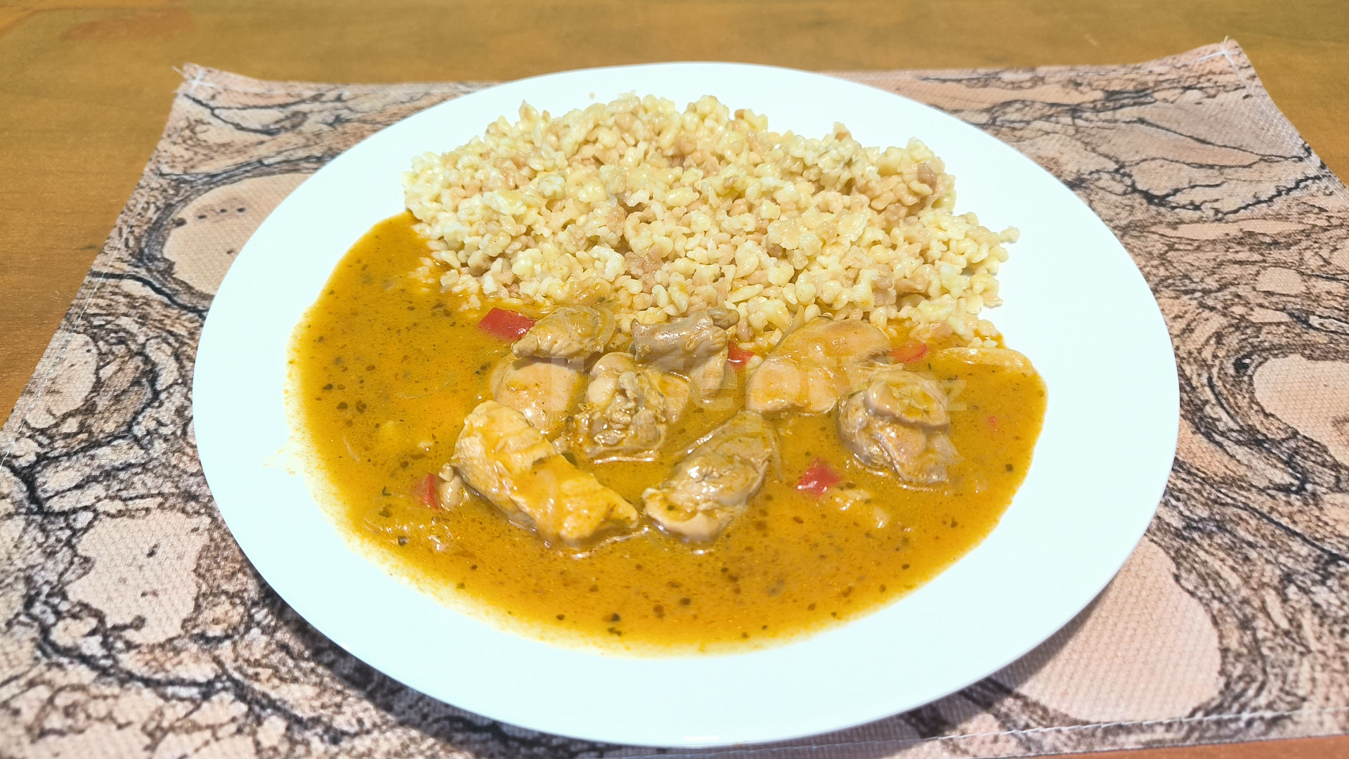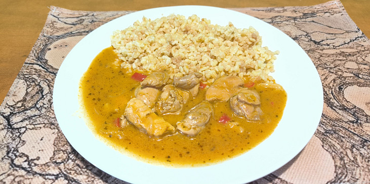 prsa kuřecí, vývar drůbeží, víno bílé, smetana ke šlehání, cibule, česnek, sádlo, máslo, kapie, protlak rajčatový, hořčice dijonská, sůl, pepř mletý, paprika sušená sladká, paprika sušená uzená, majoránka, kmín drcený, petrželka