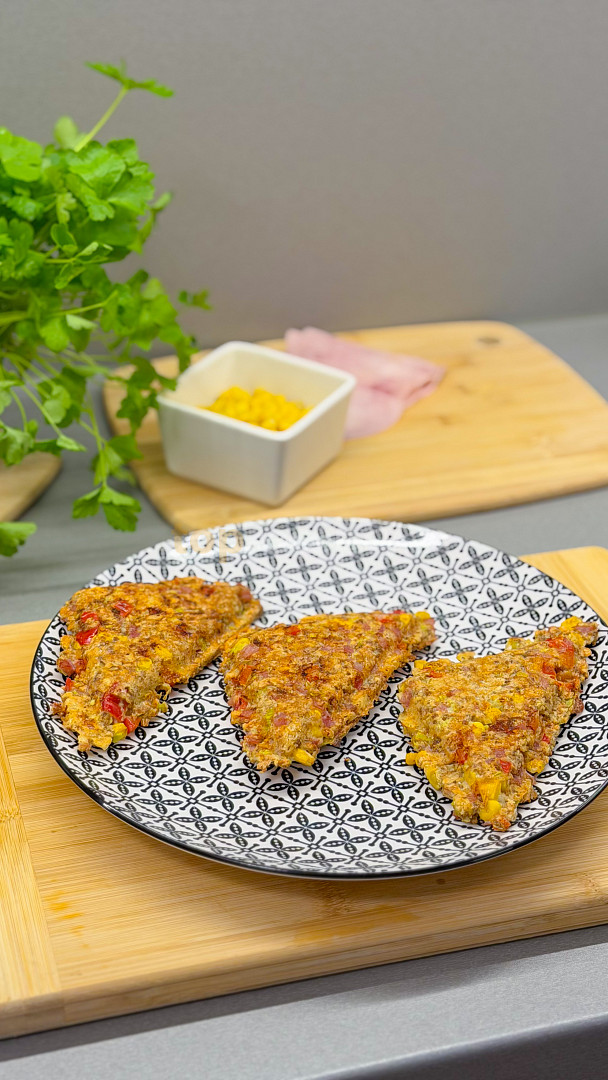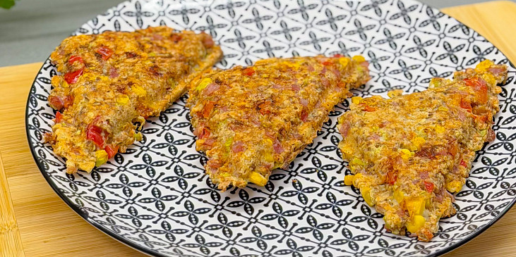 vejce, vločky ovesné, šunka, sýr tvrdý, kukuřice sterilovaná, pórek, paprika čerstvá červená, olej