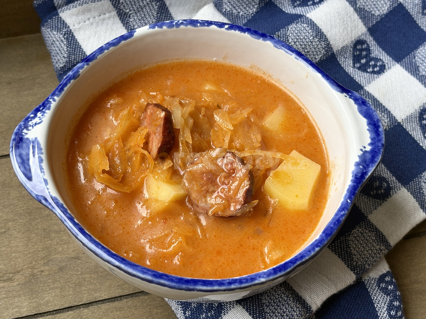 zelí kysané, vývar hovězí, cibule, brambory, klobása, ghee, mouka rýžová, bobkový list, koření nové koření, kmín mletý, paprika sušená sladká, smetana zakysaná