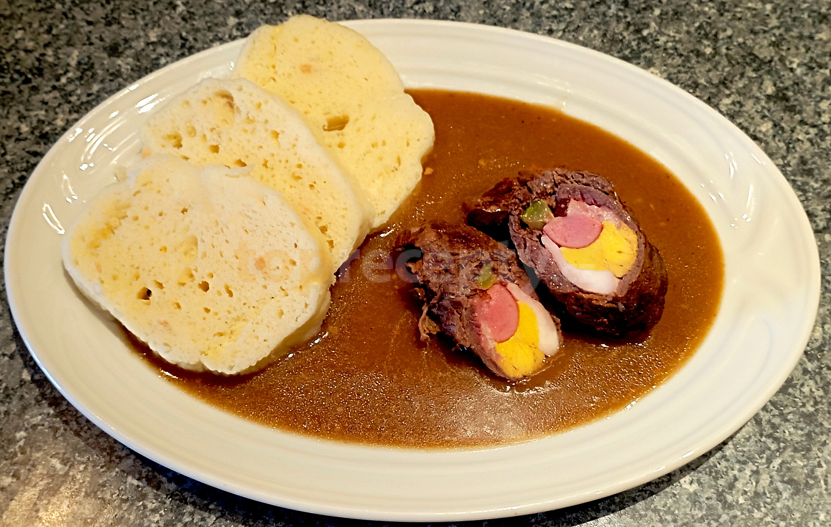 hovězí zadní, vejce, hranolky, hranolky, okurky sterilované, hořčice plnotučná, cibule, bobkový list, koření nové koření, olej, mouka hladká, sůl, pepř mletý