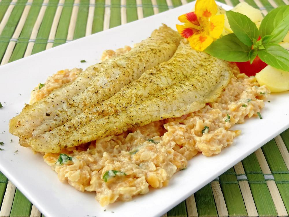 filet z tresky, cibule, čočka červená, česnek, smetana zakysaná, vývar zeleninový, olej, sůl, pepř mletý, koření na ryby, ocet, šťáva citronová, petrželka