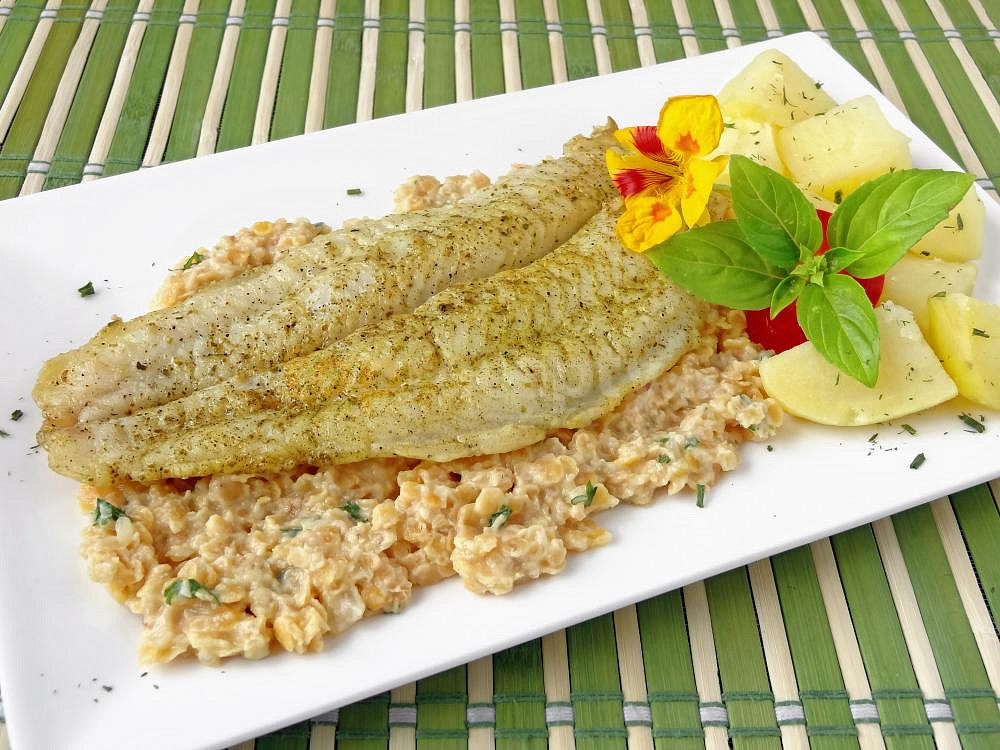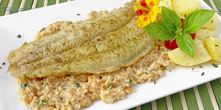 filet z tresky, cibule, čočka červená, česnek, smetana zakysaná, vývar zeleninový, olej, sůl, pepř mletý, koření na ryby, ocet, šťáva citronová, petrželka