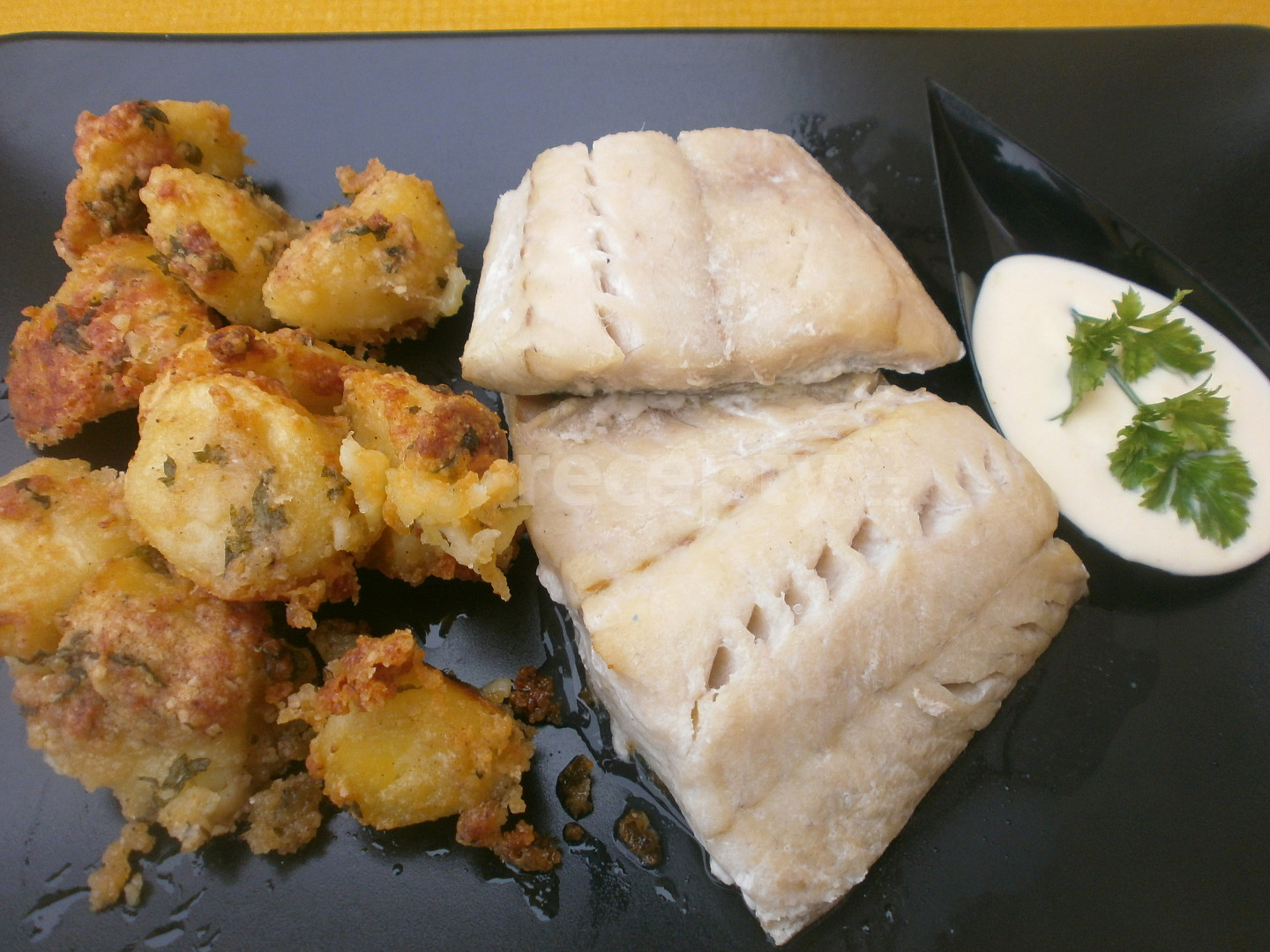 treska, citron, sůl, pepř bílý mletý, olej, máslo, brambory, parmazán, olej olivový, sůl, ořech muškátový, mouka hladká, petrželka, jogurt bílý, majonéza, citron bio, sůl, pepř bílý mletý, med