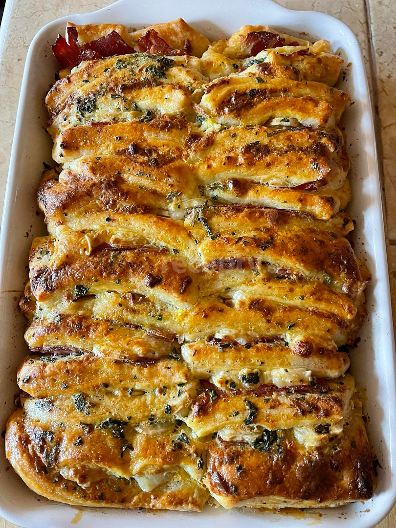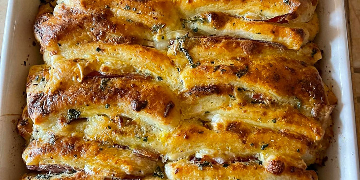 mouka hladká, kyška, voda, vejce, droždí, olej, sádlo, cibule sušená, cukr, sůl, máslo, česnek, slanina anglická, sýr strouhaný, bylinky, sůl, pepř