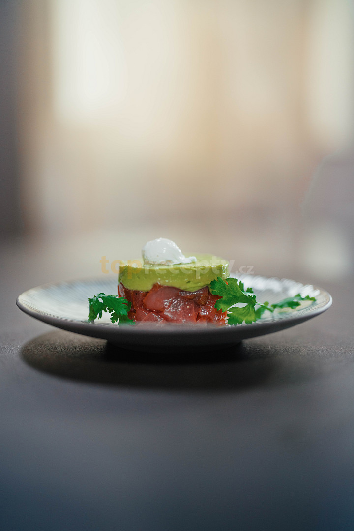 tuňák, omáčka rybí, omáčka sojová, pepř mletý, olej olivový, žloutek, koriandr čerstvý, šťáva limetková, avokádo, olej rostlinný, šťáva limetková, sůl, koření sumac, vajíčka křepelčí, ocet, voda