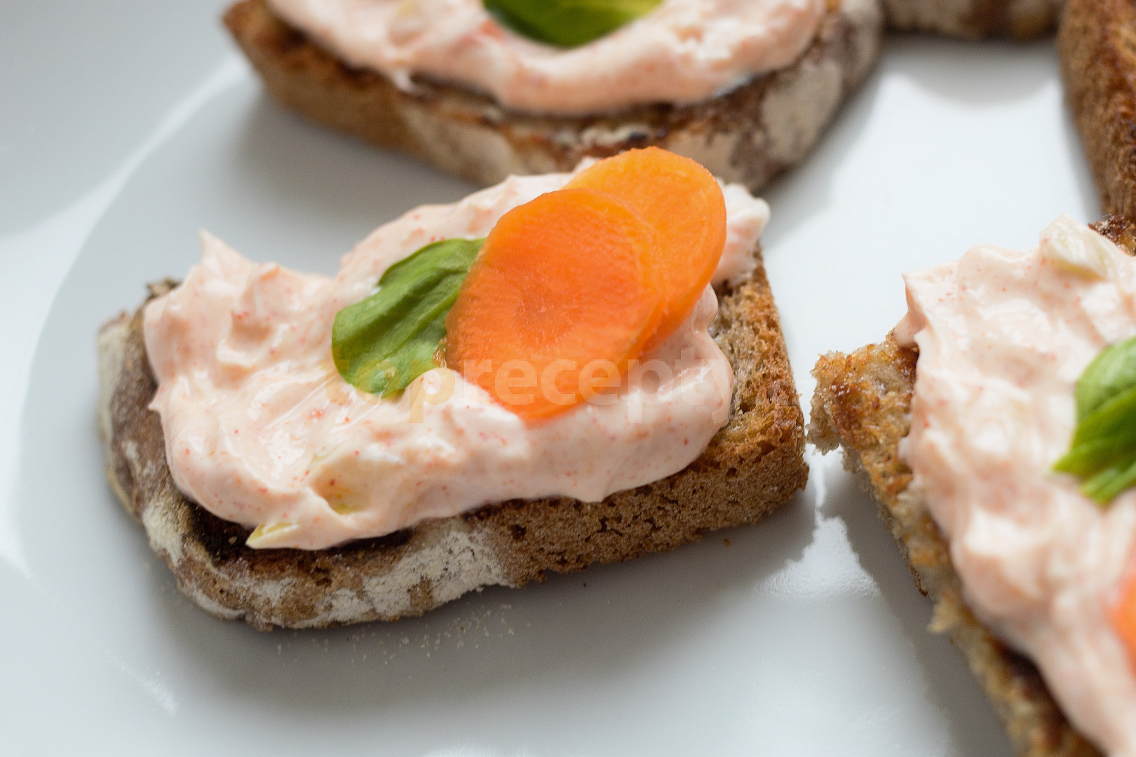 tvaroh ve vaničce, cibule, olej olivový, sůl, paprika sušená sladká, topinka, česnek
